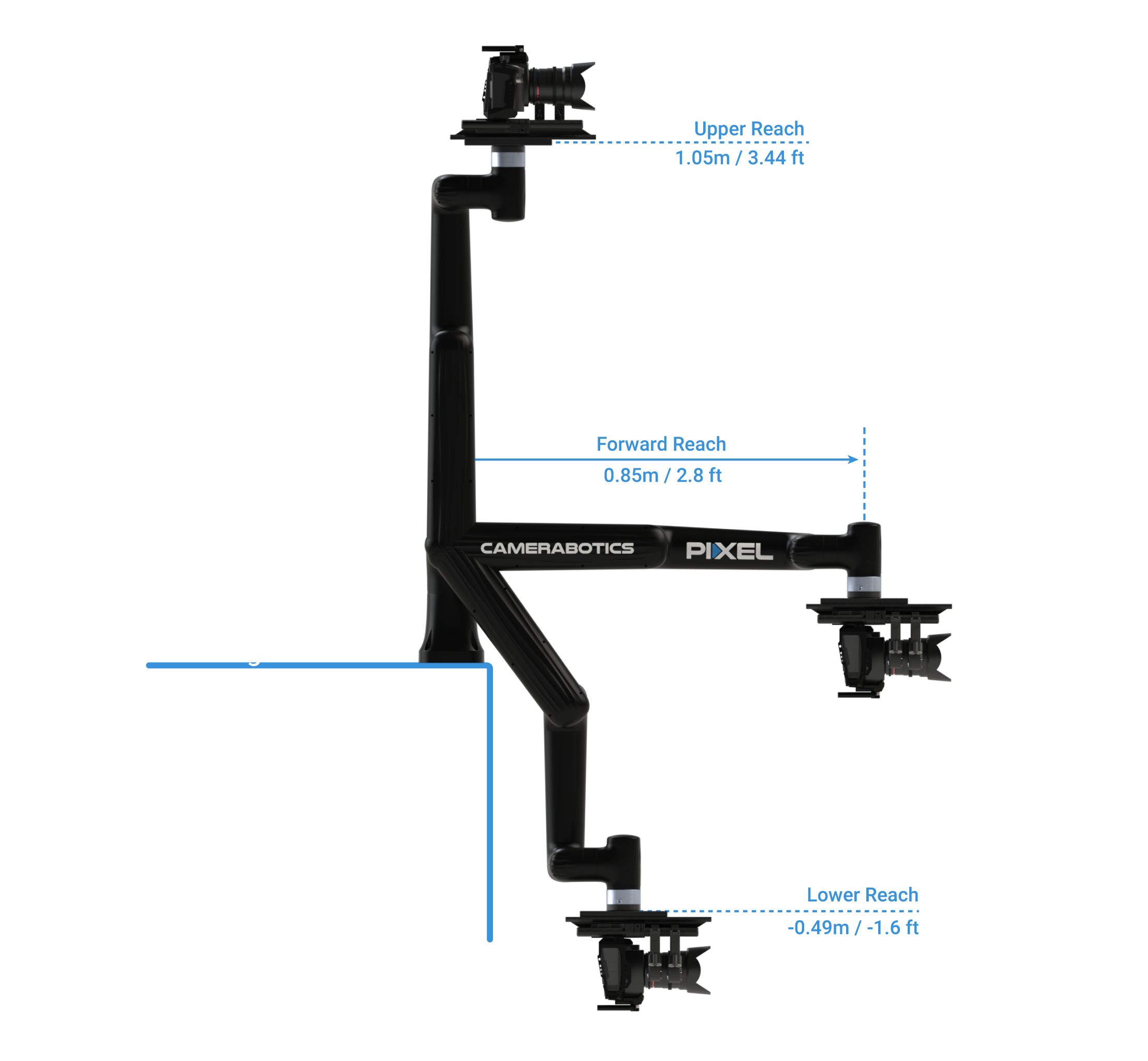 PIXEL has a well-balanced arm of nearly 85cm that can carry up 5 killos – enough for most professional cameras – that graciously moves around to cover your whole workspace.